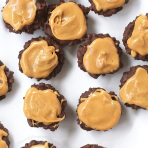 - Start by carefully melting the chocolate. Stir in the oil, if using. (I always use it, because it makes the chocolate much smoother.) You can either stir some nut butter in with the chocolate now or save it for later to add on top if you wish. Stir everything together with the rice crispies. Smooth into a lined muffin tin or mini muffin tin, OR use a mini cookie scoop and place on a parchment-lined plate. Refrigerate or freeze to set. Top with peanut butter if desired. I like to store leftovers in the fridge, but they can easily be taken to a party or left out at room temperature for a few hours without melting.View Nutrition Facts